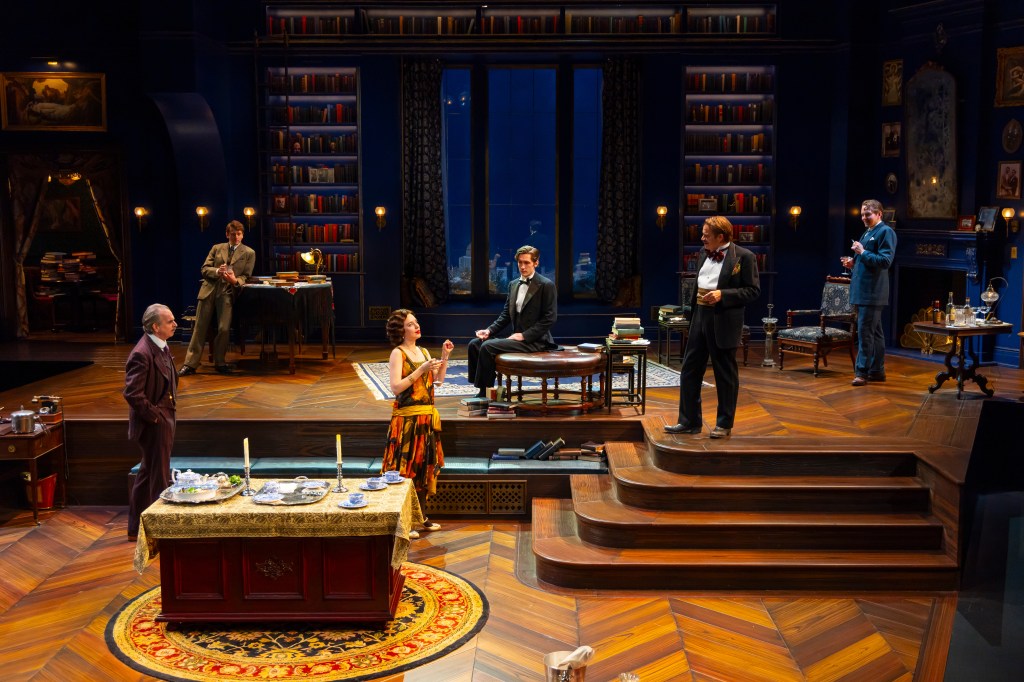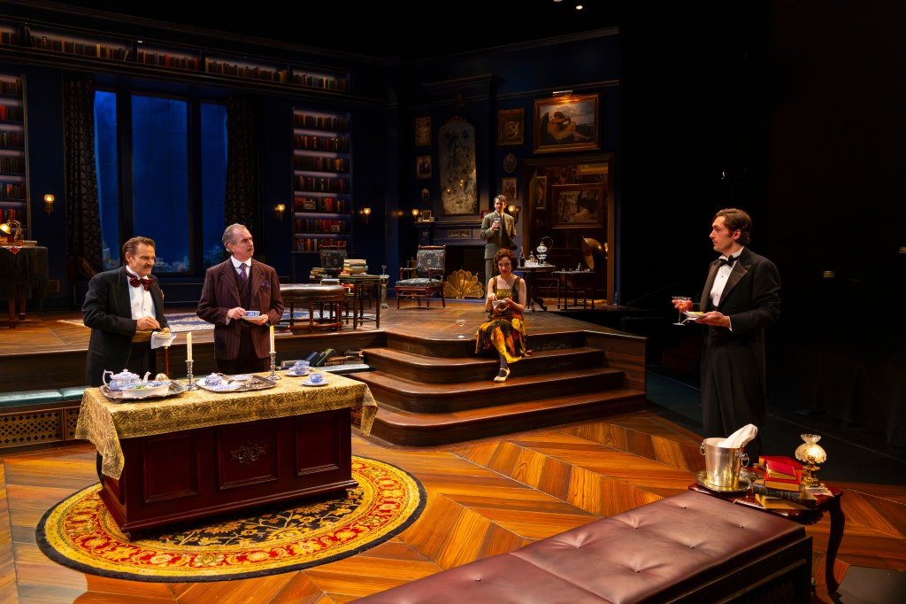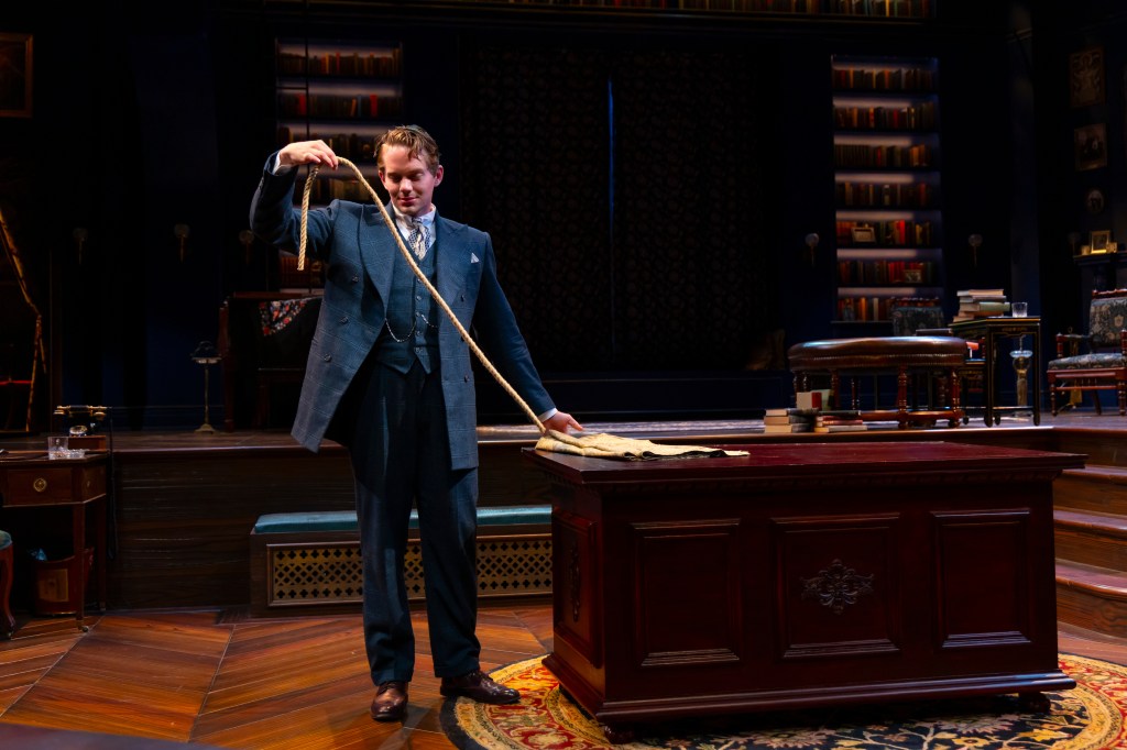 The original play, Rope’s End was loosely inspired by the 1924 murder of Bobby Franks, who was killed by duo Nathan Leopold and Richard Loeb. The play premiered in 1929 and was later adapted into the film Rope, directed by Alfred Hitchcock. Like the original play by Hamilton, this version of Rope returns the plot back to London, in a flat in Mayfair in the late 1920s. Riw Rakkulchon’s scenic design is gorgeous and immersive with stacks of bookshelves, giving a sense of intellectual extravagance. The most important item in the room, a chest that sits center stage that Lewis and Brandon gaze into at the top of the show. Inside is the body of Ronald, a fellow schoolmate, well, former schoolmate now, whom they just killed with a length of rope.